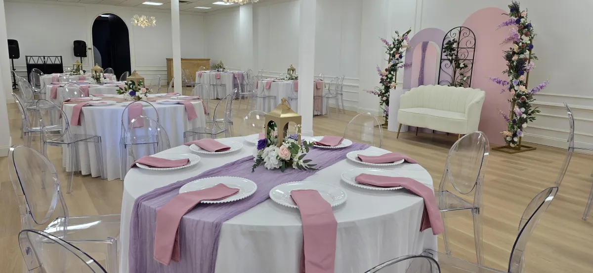 Style included – Every package comes with tables, chairs, linens, sound system, DJ booth, and tasteful décor, ready to go.